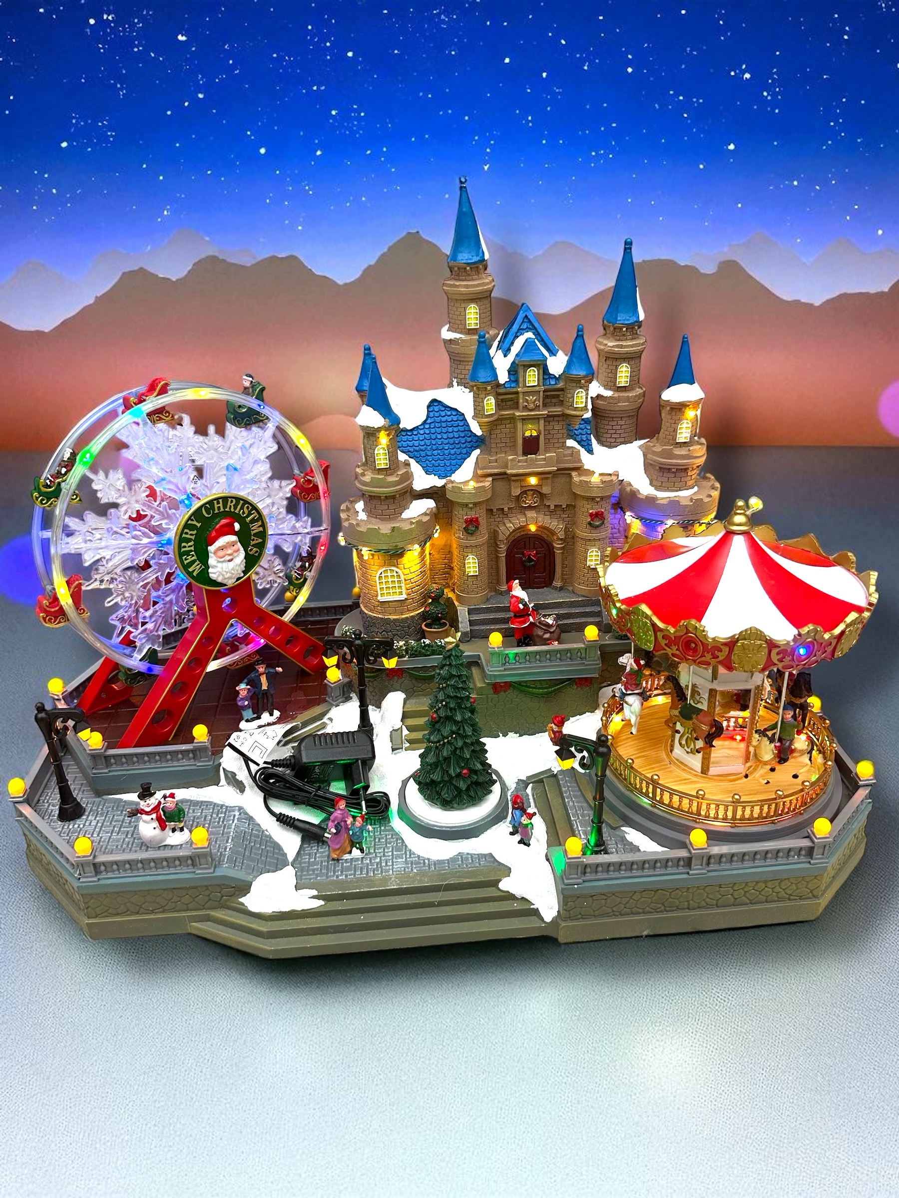 • Movimento: la ruota panoramica e il carosello sono motorizzati e ruotano, tipici di questi articoli natalizi da collezione.